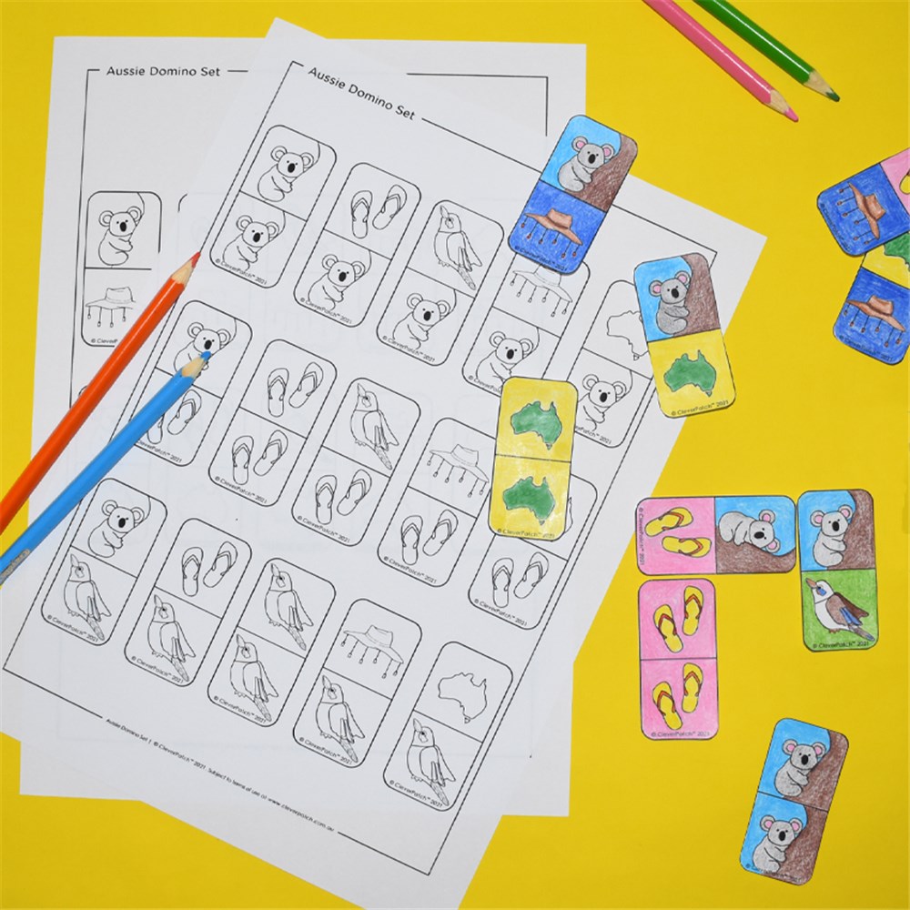 • Step 3Cut out your completed designs. Adult supervision is recommended when using scissors. Now you are ready to use your Aussie Dominoes! You can also laminate your dominoes to help them last longer.