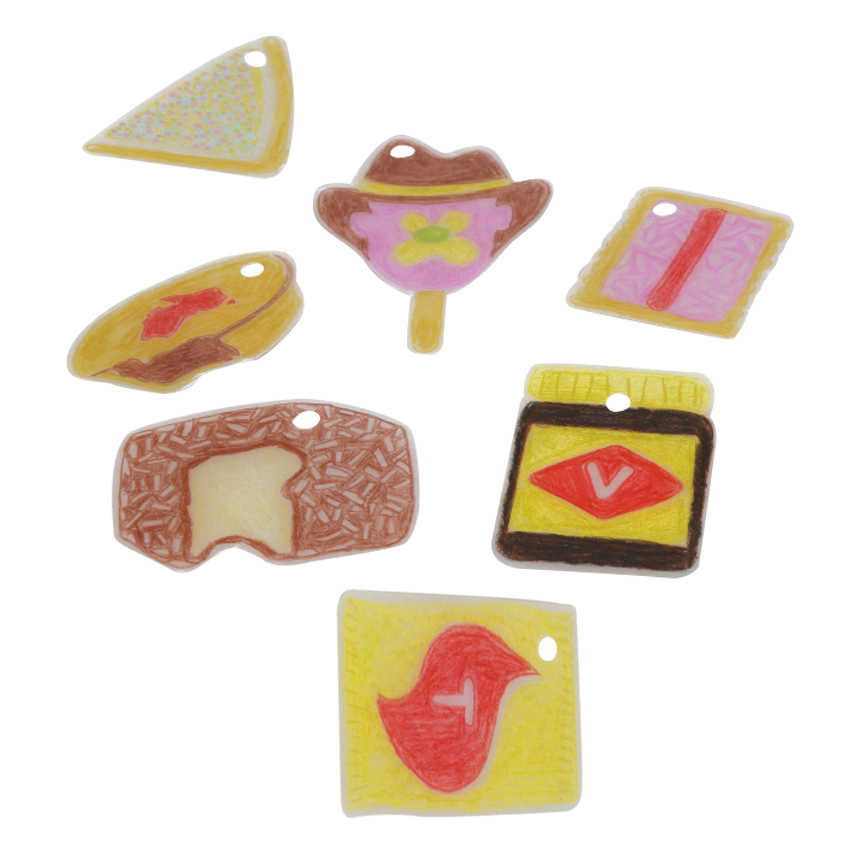 • Step 2Place the template under a sheet of shrink plastic film, making sure the shiny side is facing down. Use pencils to trace over your favourite snacks from the template. Once complete, carefully cut the snacks out and punch a hole in the top of each one. Adult supervision is recommended when using scissors.