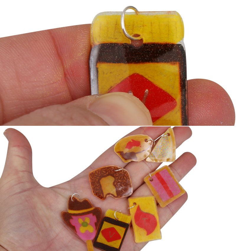• Step 3Bake the shrink film following the instructions included in the pack. Once cooled, loop a jump ring through the hole in each of the snacks and use pliers to close shut. Your charms are ready to thread onto a bracelet!