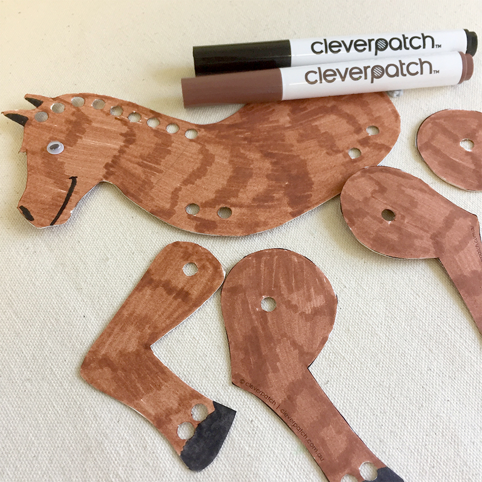 • Step 3Use markers, pencils or paints to decorate your horse. Make sure to colour both sides! Add character to your horse with some wiggle eyes and a smiling face.