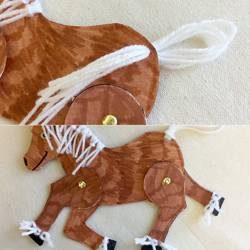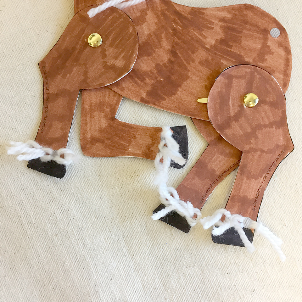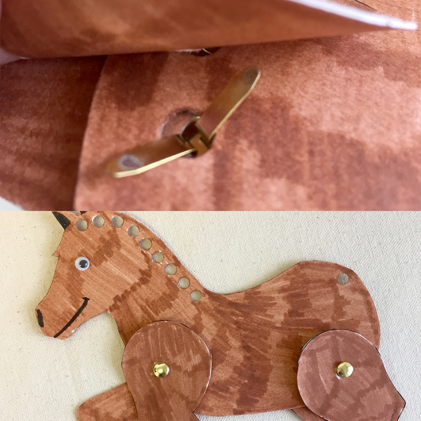 • Step 4Lay the pieces onto each other before you begin so you know which legs will go where. The body of the horse will sit between the legs. Slide paper fasteners through the corresponding holes and bend the back of the paper fasteners to hold in place while still allowing easy movement.