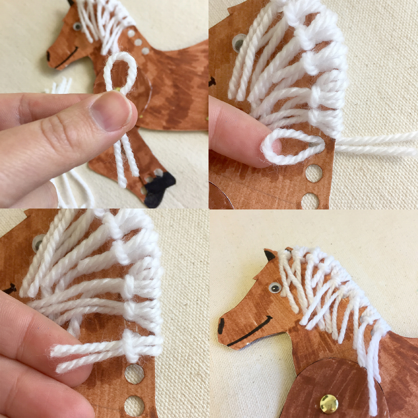 • Step 5Cut 18 pieces of wool, each measuring 12cm long. Take a piece and fold in half. Thread the looped end into one of the holes along the horses neck and loop the 2 ends over and through the loop to create a cow hitch knot as shown. Repeat this with another piece in the same hole. Continue this technique using 2 pieces in each hole until the mane is full.