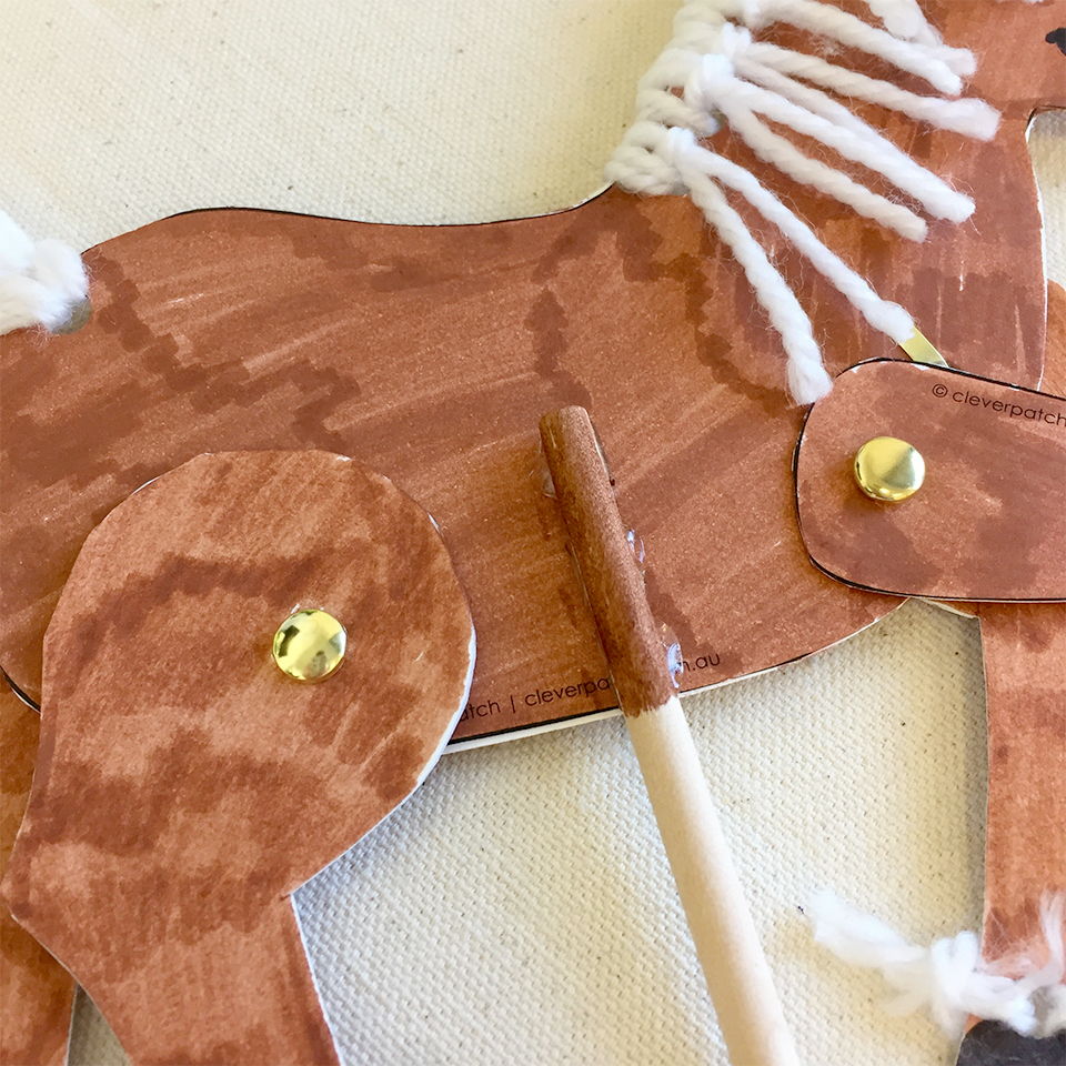 • Step 8Using 3 glue dots, attach the skewer to the middle of the horse. Press firmly for a strong hold. Colour the top of the skewer the same colour as the horse and you are now ready to gallop in the fields!