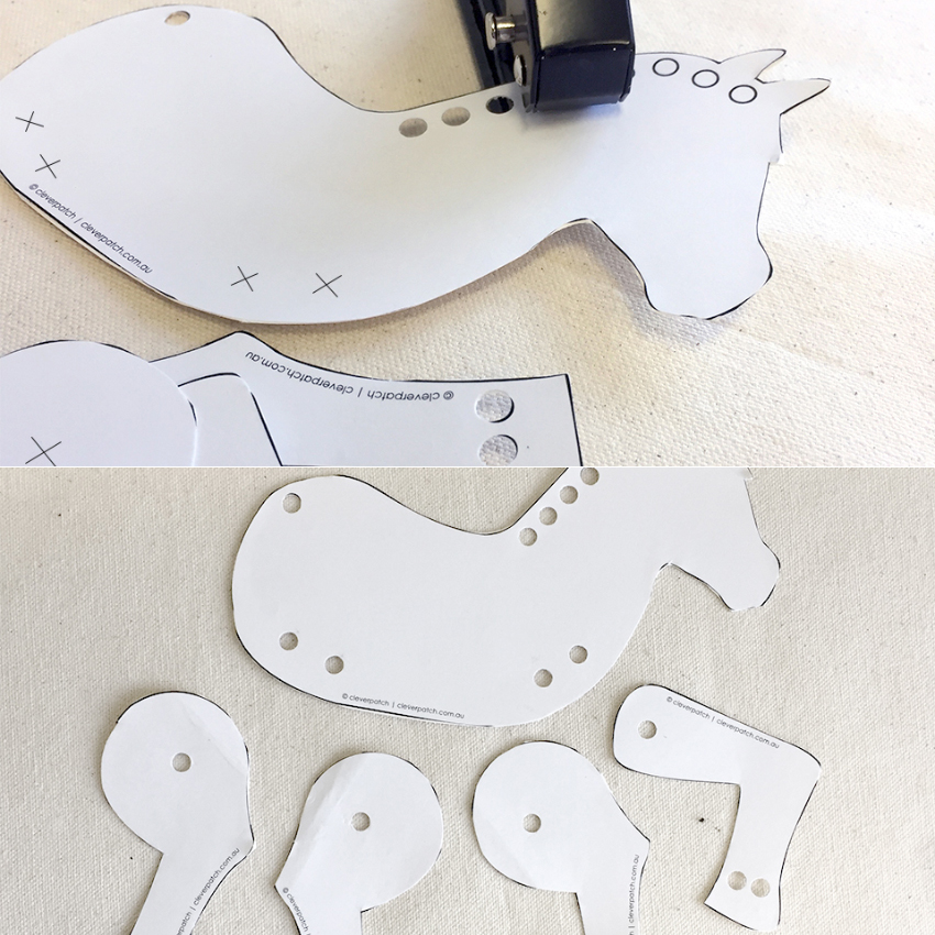 • Step 2Take your hole punch and carefully punch out the holes in the template as indicated by the circles. You will also need to punch holes where the X’s are – these indicate where the paper fasteners will be going.