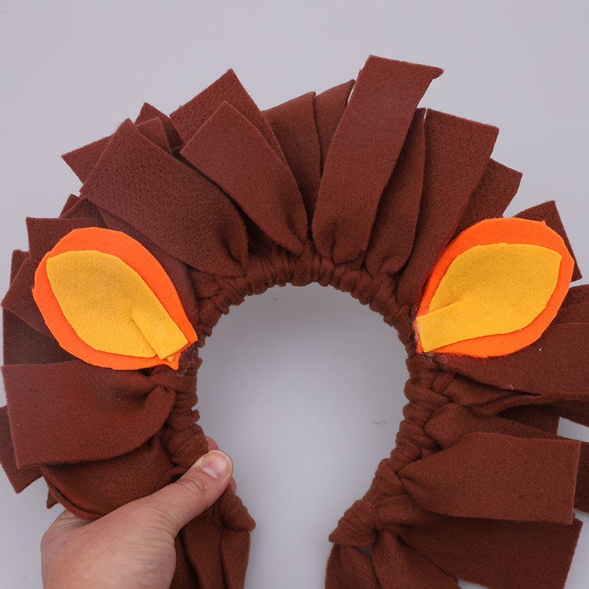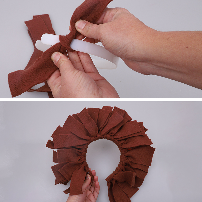 • Step 3Take the first strip and tie it onto the head band. A single knot will be fine as the felt will have stretch in it. Continue tying strips of felt onto the head band until it is completely covered, creating a lion’s mane.