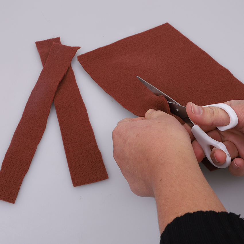 • Step 2Take six squares of brown felt and cut each square into six even strips. When cutting, be sure to cut WITH the stretch of the felt and not across it. Adult supervision is recommended when using scissors.