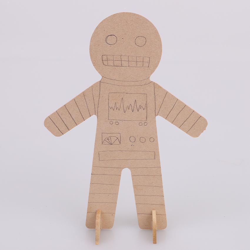• Step 4Use your choice of paint or markers to decorate your wooden character design and your chosen accessories. Allow to dry if needed. Cut out your cardboard accessories. Adult supervision is recommended when using scissors. Attach your accessories with glue to bring your character to life. Allow to dry.