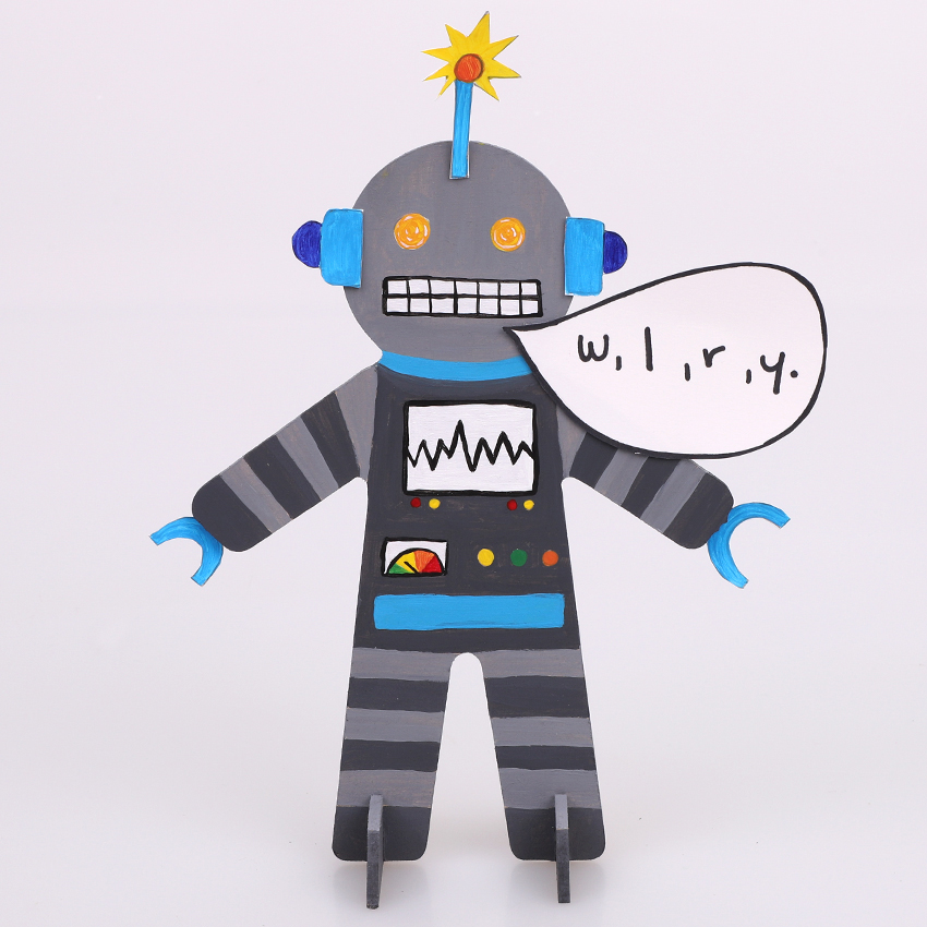 • Step 5Cut out a speech bubble shape and write in the sounds that your character makes. Glue the shape to your character and allow to dry. Alternatively, you can write the sounds on the back of the wooden shape.
