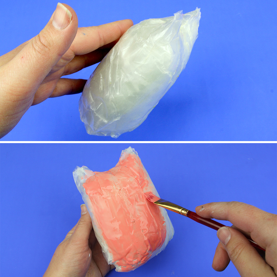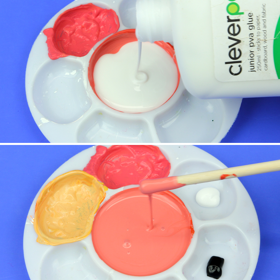 • Step 5Add PVA glue to your paint colours and mix in. The PVA glue will allow the paint to be more flexible, so it won’t crack when you’re playing with the squishy. The paint will simply colour the glue which dries clear, so mix in as much glue as needed to cover the squishy.