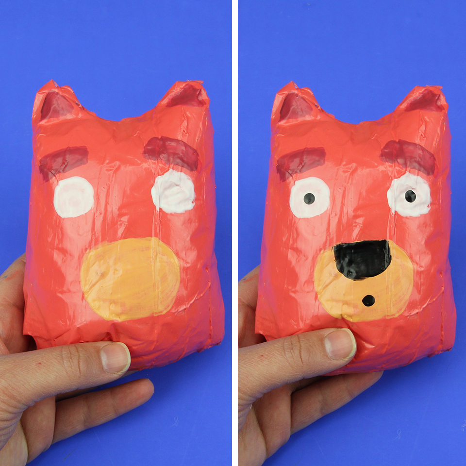 • Step 7Once the base coats are complete, paint on Bear’s features using the same layering technique and finish the face by adding in the eyes, pupils, nose, and mouth. Allow everything to dry completely.