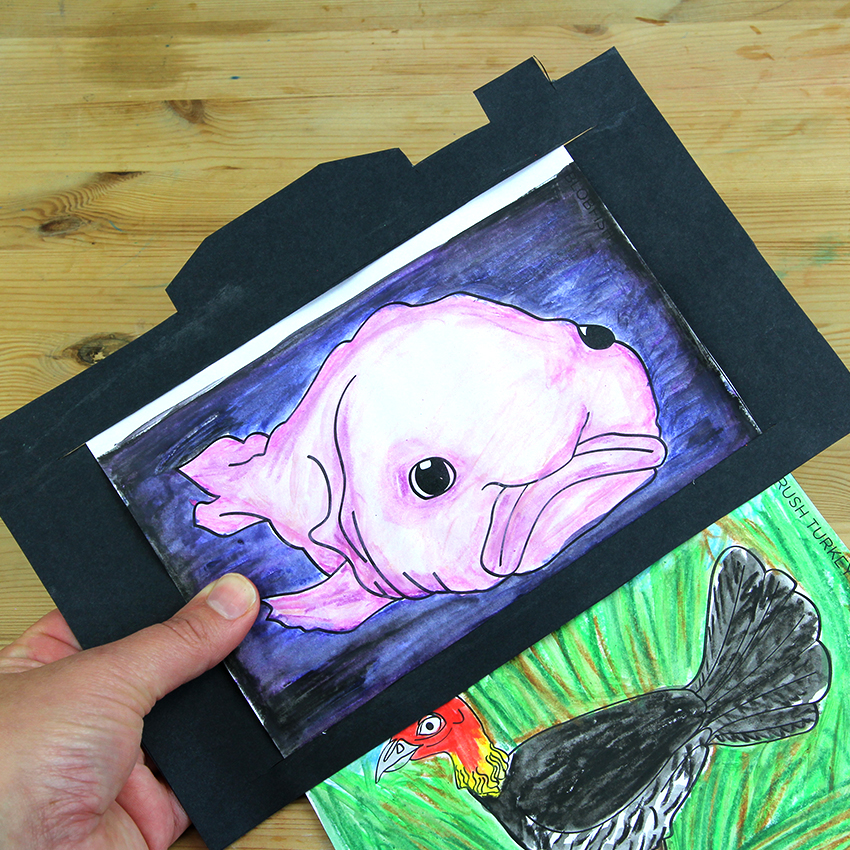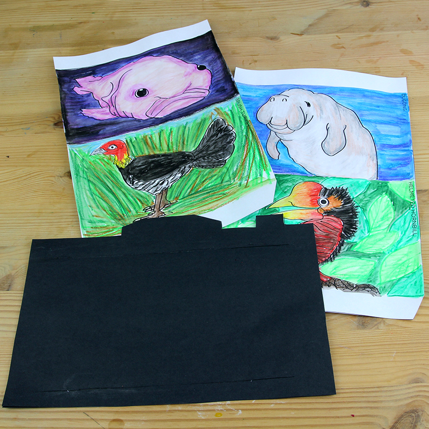 • Step 4Slide the “film” from the back of the camera template, up through the bottom slit and then back down through the top slit so that it can slide up and down. Move the film through the camera and view the animals as you read through The Illustrated Encyclopaedia of Ugly Animals!