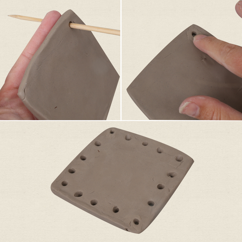 • Step 2Use a scratch board tool to pierce a hole in each of the corners, then another 3 holes along each of the edges, until there are holes all the way around. Use your finger to smooth out the back. Allow the clay to air dry.