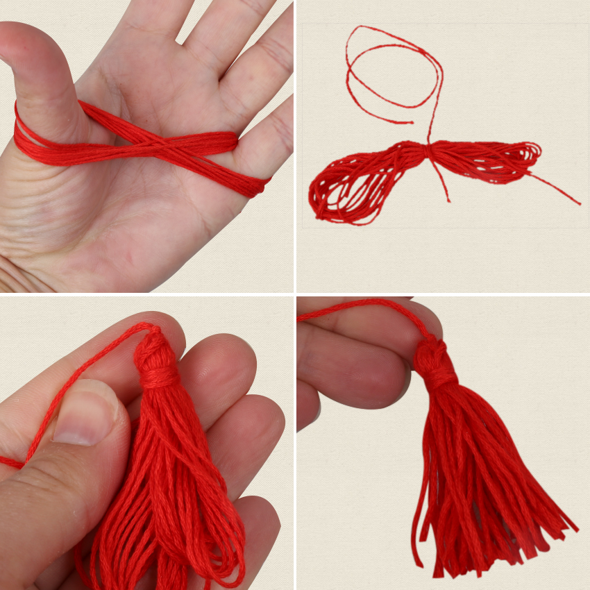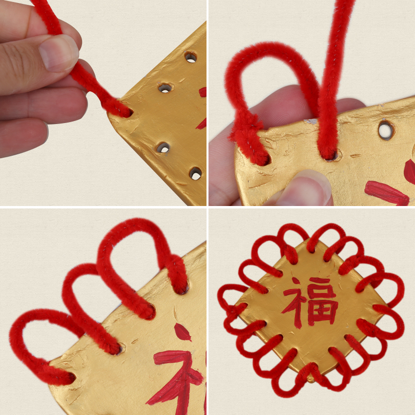 • Step 7Take 30cm of thread and loop it through the top hole, tying it at the top to create a hanger. Finish your ornament by tying the tassel through the bottom hole. Your Good Fortune Ornament is now ready to hang!