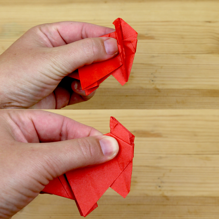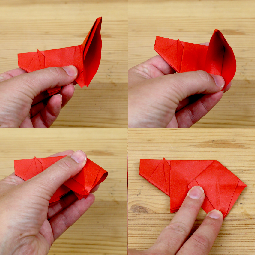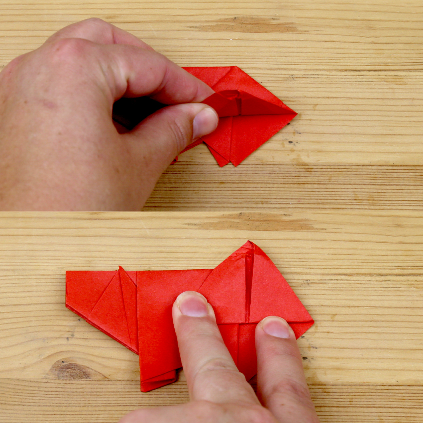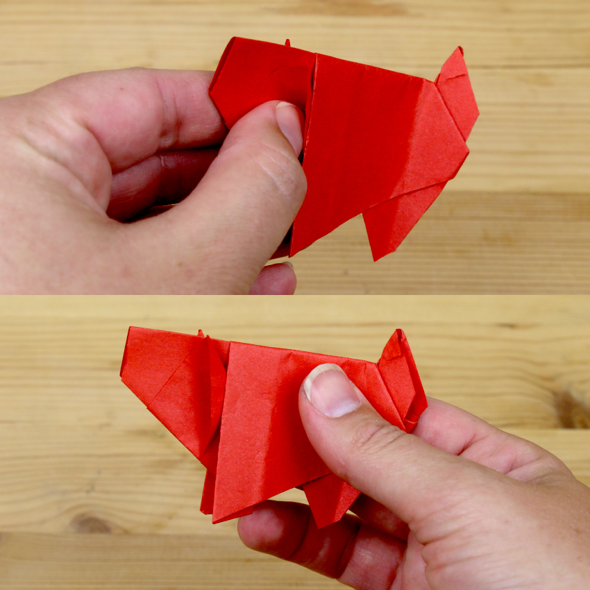 • Step 16Move to the front of the pig and wiggle your thumb under the flap of paper that sits just in front of the front legs. Push it outwards to open up what will be the pigs ear and then repeat on the other side. Your adorable pig is now ready!