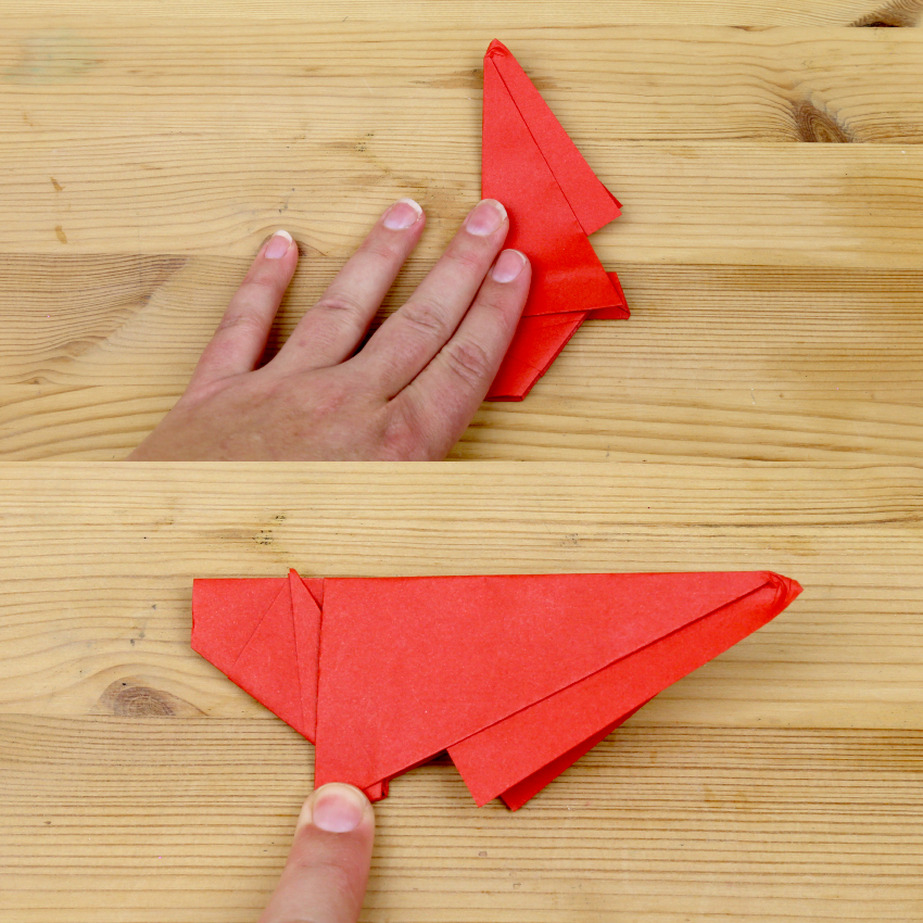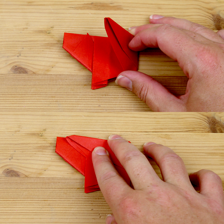 • Step 13Pick up the pig and as you fold the back point back out, work your finger between the layers to open it out into a leaf shape. Take the top point and fold it down to the bottom point. Push the shape flat and crease to create a diamond shape.