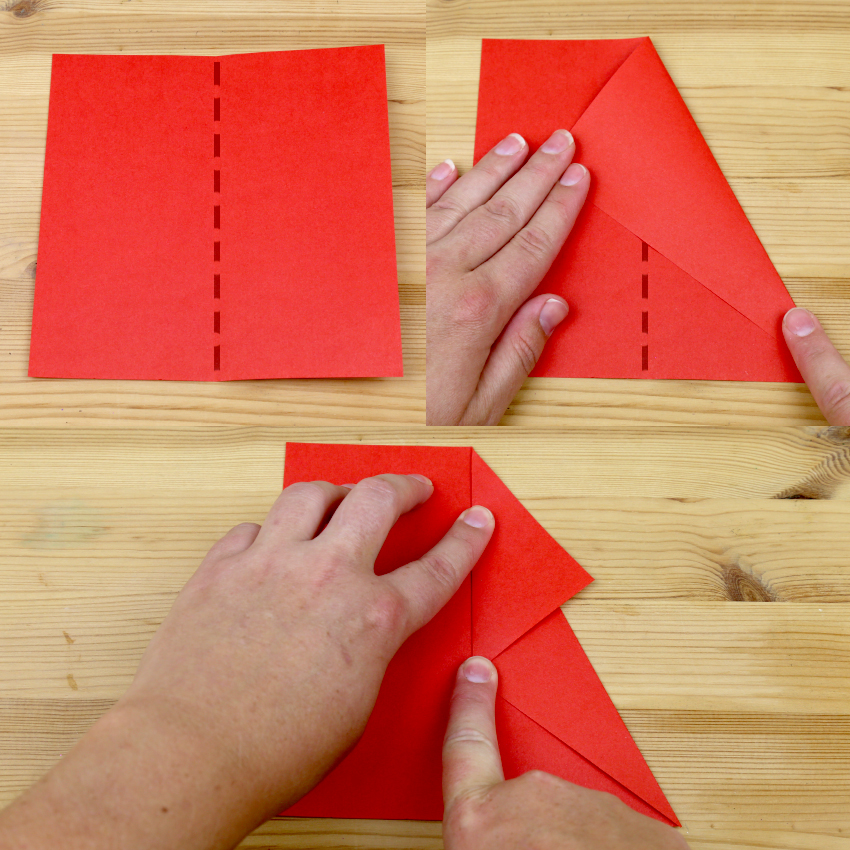 • Step 4Fold the top left corner down onto the point that now sticks out to the right. Create a crease that runs from the top centre all the way down to the bottom left corner.