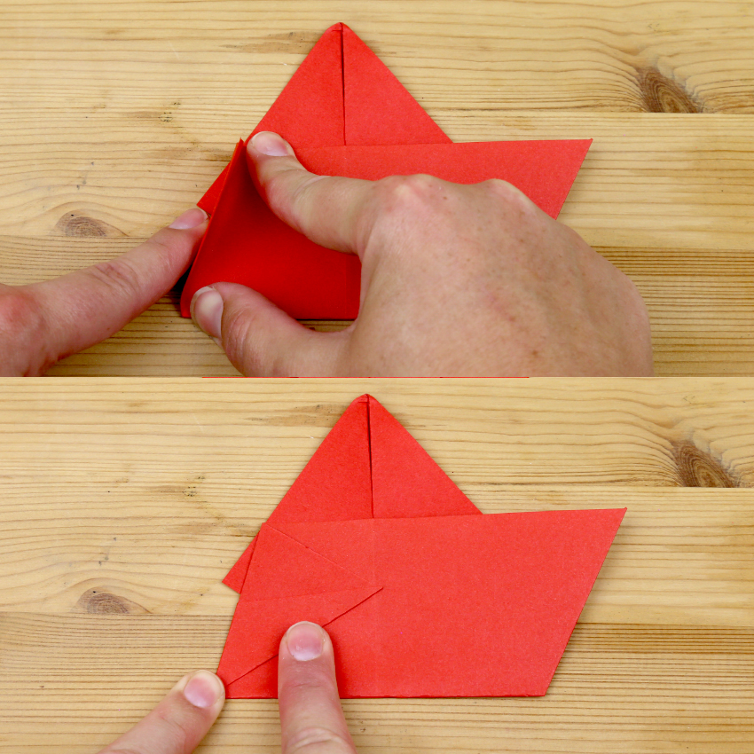 • Step 12Fold the right hand point (the back of the pig) across to the left, making a vertical crease firmly at the back leg.