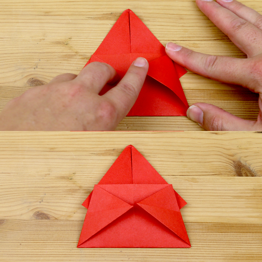 • Step 14Take the bottom point and fold upwards. Make sure to only fold the top layer and then crease firmly to form a horizontal line across the centre of the diamond.