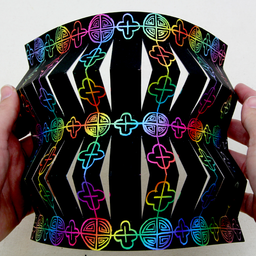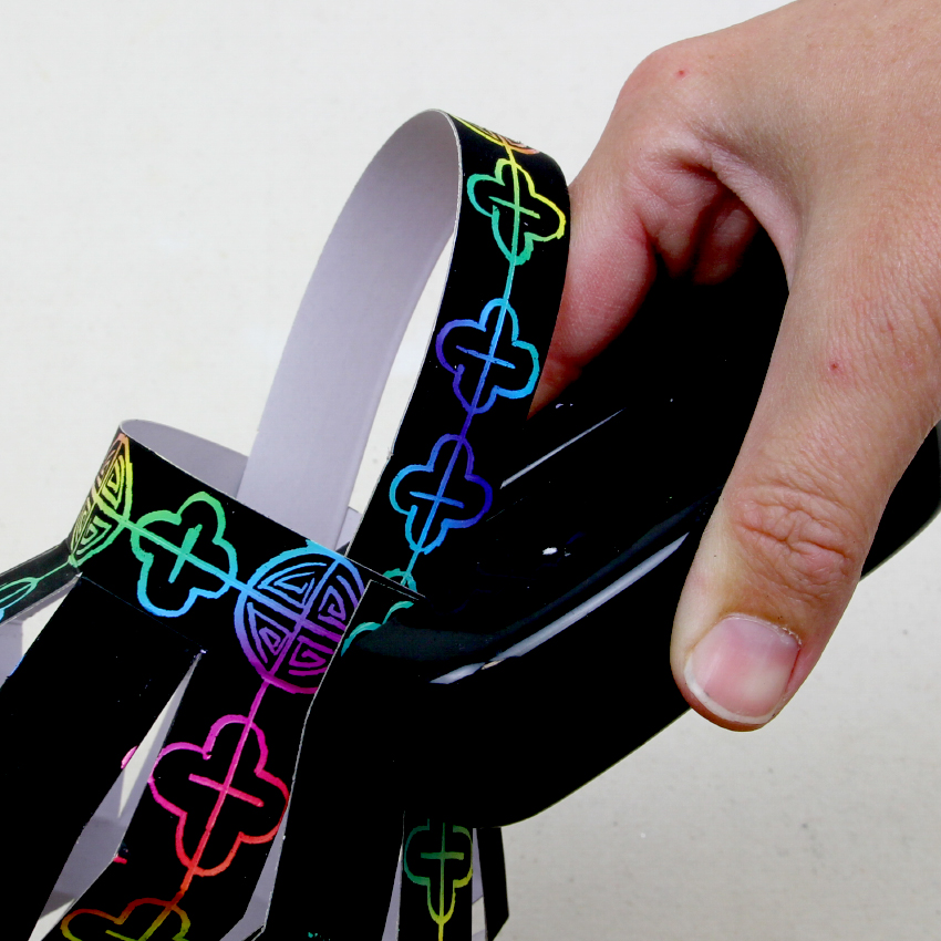 • Step 4Fold the lantern along the scored lines to prepare for assembly. You will need to mountain fold (fold outwards) the lines that run across the 2 pre-cut sections of scratch board.