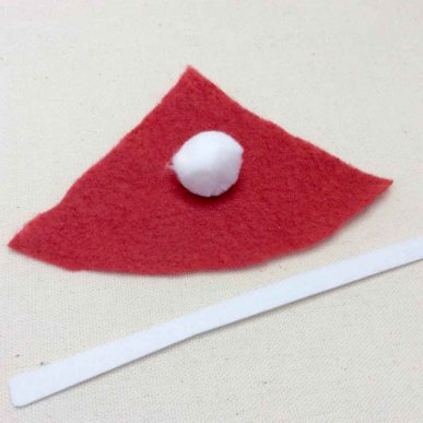 • Step 9Using the hat template, cut out Santa’s hat from red felt. Make the hat using fabric glue and attach a thin strip of white adhesive felt around the base edge of the hat. Attach a small white pom pom to the top of his hat. The hat is not attached to Santa.