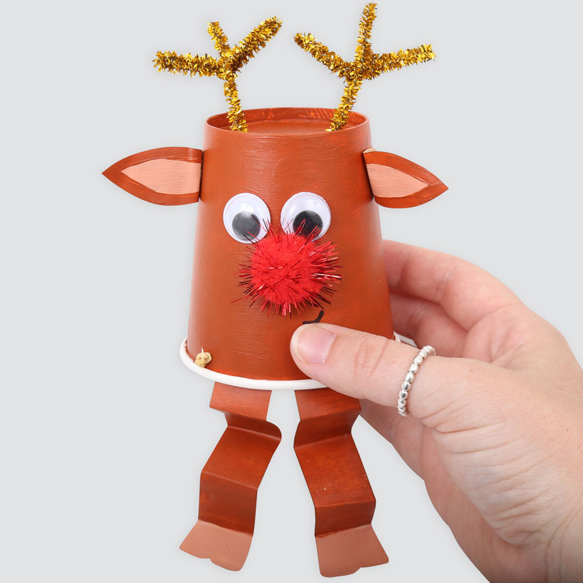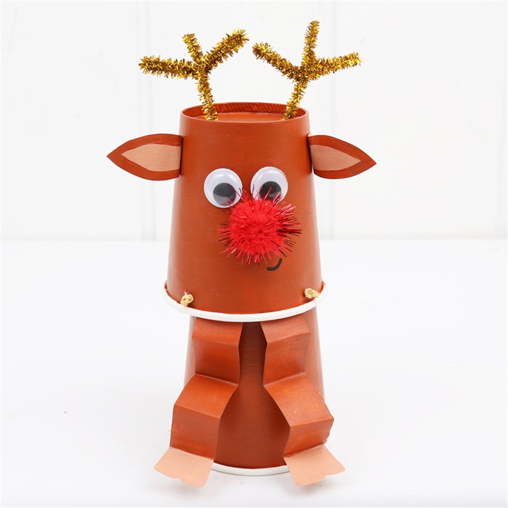• Step 6Use glue dots to attach a pom pom nose, wiggle eyes, ears and legs to the same brown cup that the antlers are in. You may also want to concertina fold the legs like we did. Place the Reindeer on top of the other brown cup, push down and let go! Watch your Flying Reindeer soar into the sky!