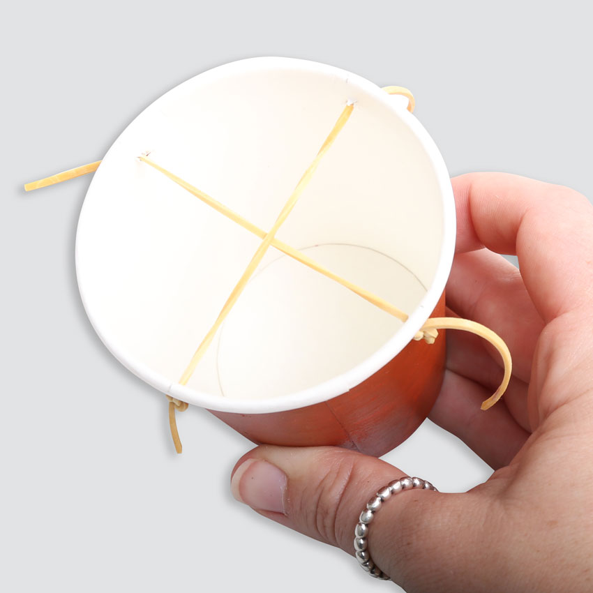 • Step 4Cut 2 rubber bands in half. Thread the end of a rubber band through one hole in the paper cup and then the other end of the band through the opposite hole. Tie each end in a knot so the band is tight. Repeat with the second band and the other two holes so that your cup looks like the image shown.
