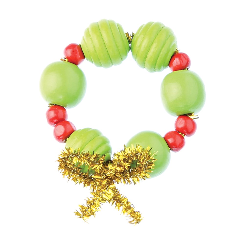 • Step 1Thread a variety of red and green beads onto a gold chenille stem and leave about 5cm without beads at each end.