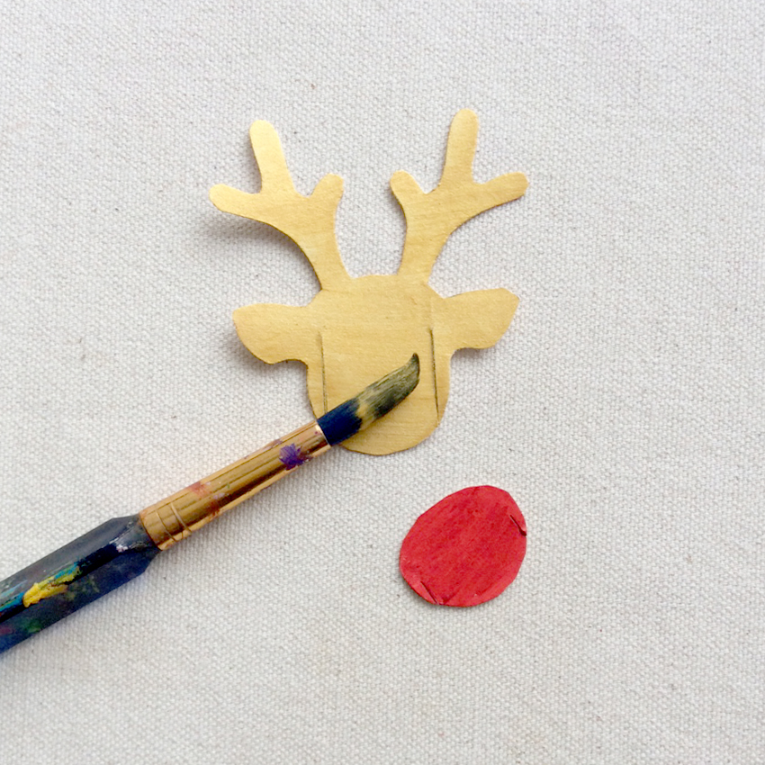 • Step 2 Paint each section of your reindeer and decorate with glitter as you wish. We used gold for our reindeer body with a red 'Rudolf' style nose and silver glitter highlights. You can use whatever colours you like!