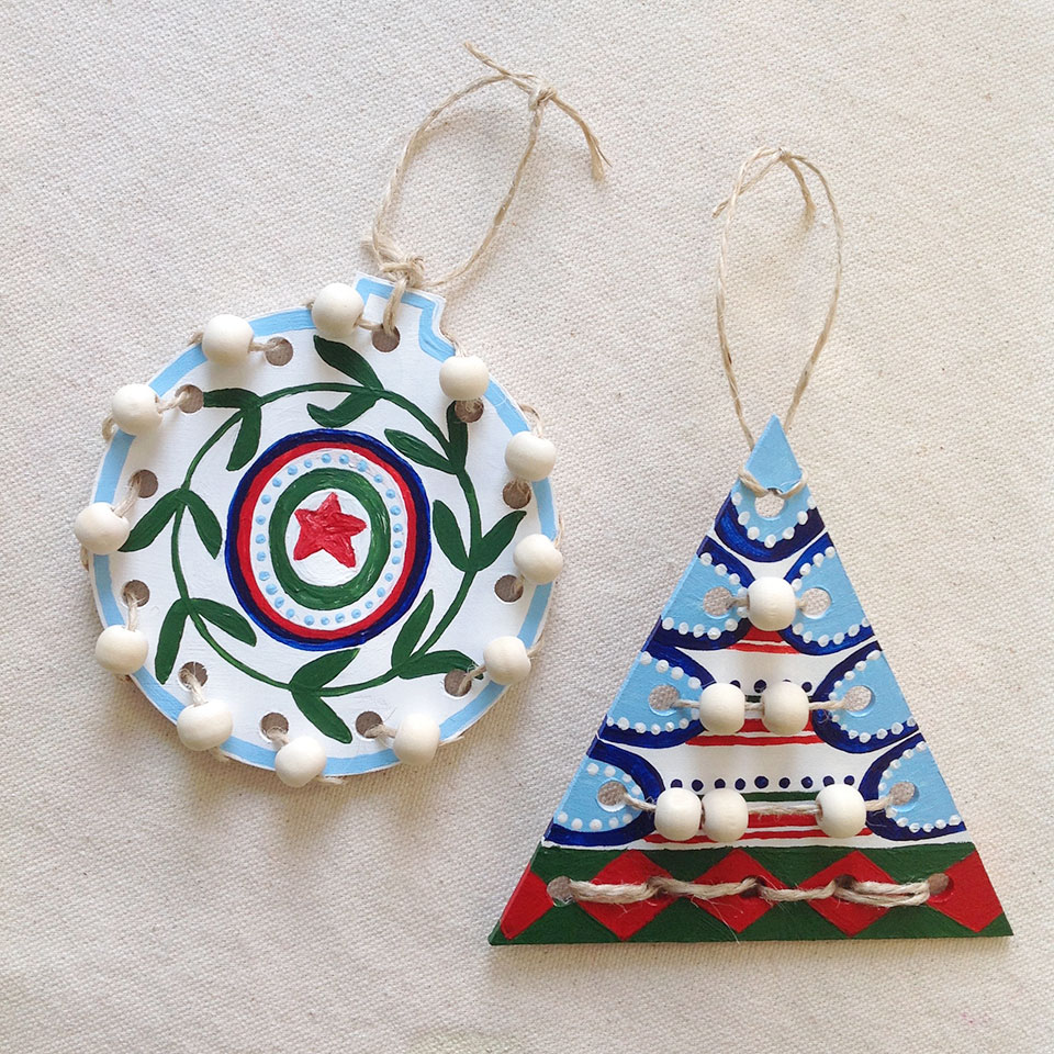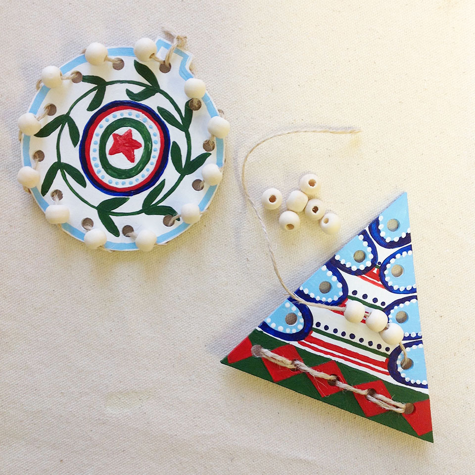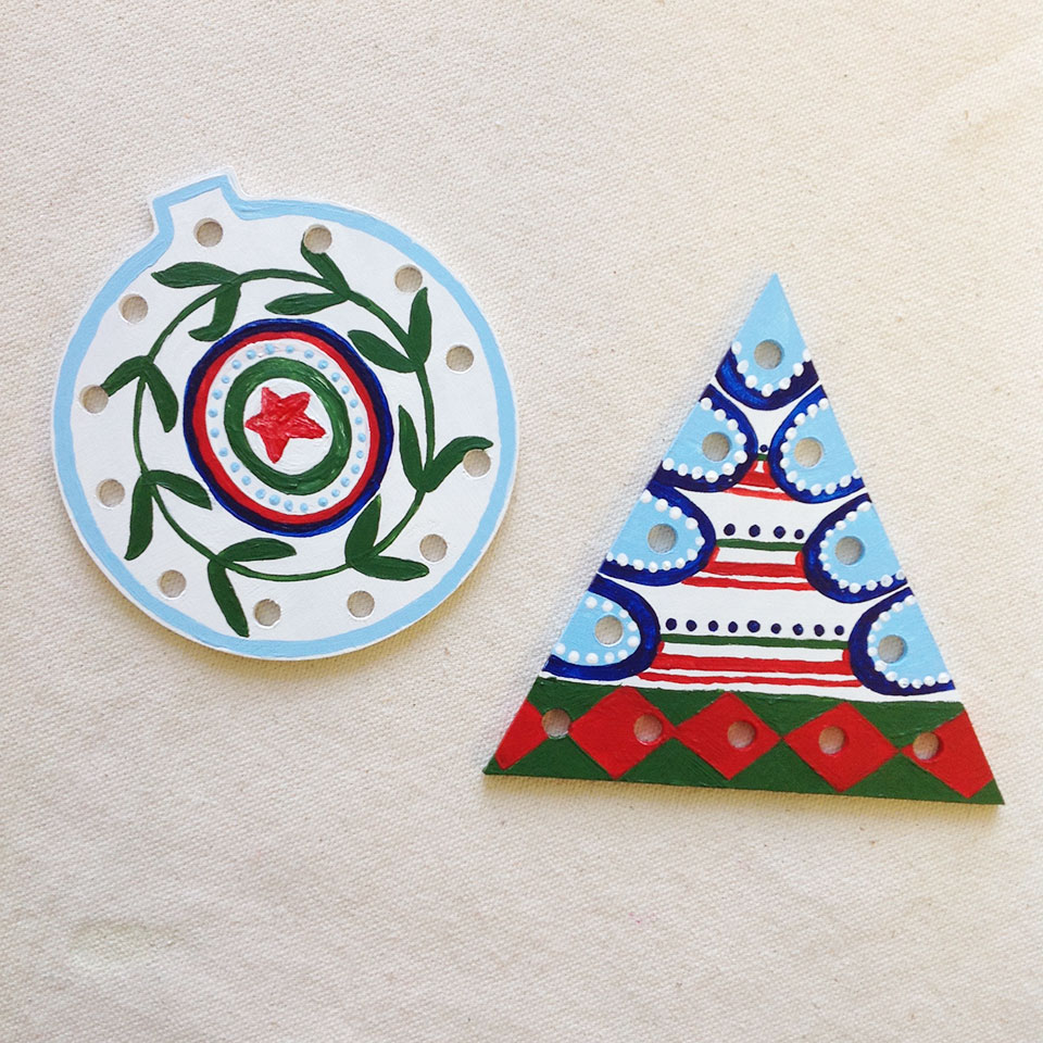 • Step 4Thread a piece of twine through the top hole and tie the ends together. This will be used to hang your weaving shapes onto your Christmas tree!