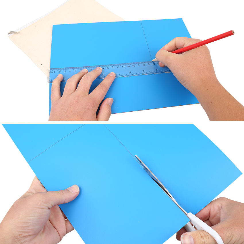 • Step 1Rule up a 20 x 12cm rectangle on the Lino Tile. This will fit nicely on the front of a cotton pencil case. Once ruled up, use scissors to cut the piece out. Adult supervision is recommended when using scissors.