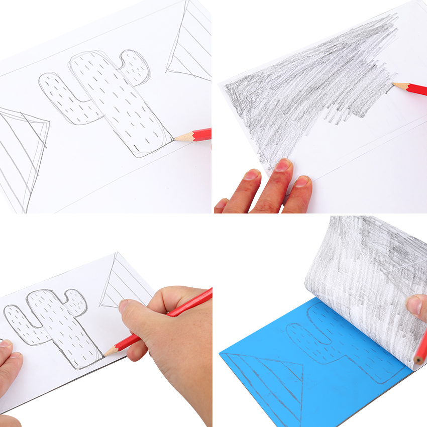 • Step 2On a piece of paper, trace around the rectangle piece of Lino and then sketch a design for your pencil case within these lines. Think about positive and negative spaces and make sure the design isn’t too complicated. Once you are happy, flip the paper over and cover the back of your design in pencil. Lay the paper with your design facing up onto the rectangle of Lino, then trace over the design, pressing firmly. Remove the paper to see your design transferred onto the Lino below.