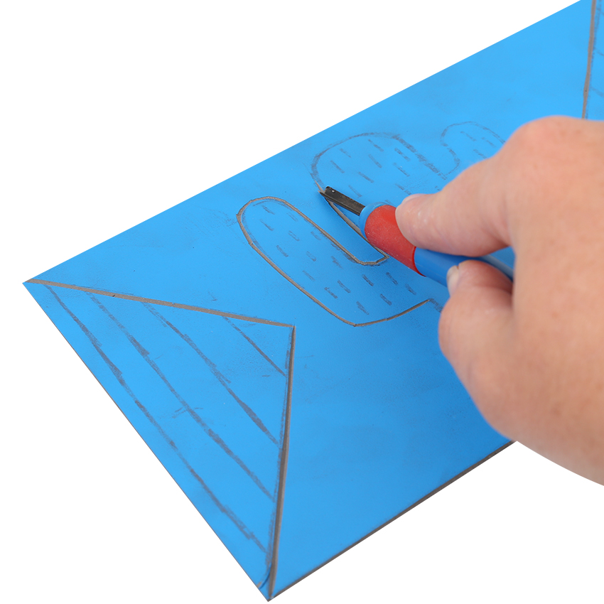 • Step 3Take a small ‘v’ Lino Tool and use this to firstly go around the outside of your shapes. Always keep one hand firmly on the tool and make sure your other hand is behind the tool. You don’t want to be carving towards your hand in case it slips!