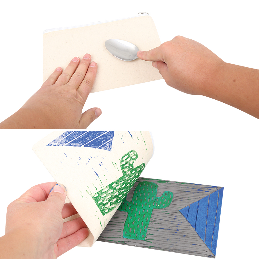• Step 9Use the back of a spoon or the heel of your hand and firmly rub the fabric to press it onto the Lino. The more thorough you are in this process, the better your print will come out. When you are happy, carefully peel the pencil case from the Lino to reveal your design!