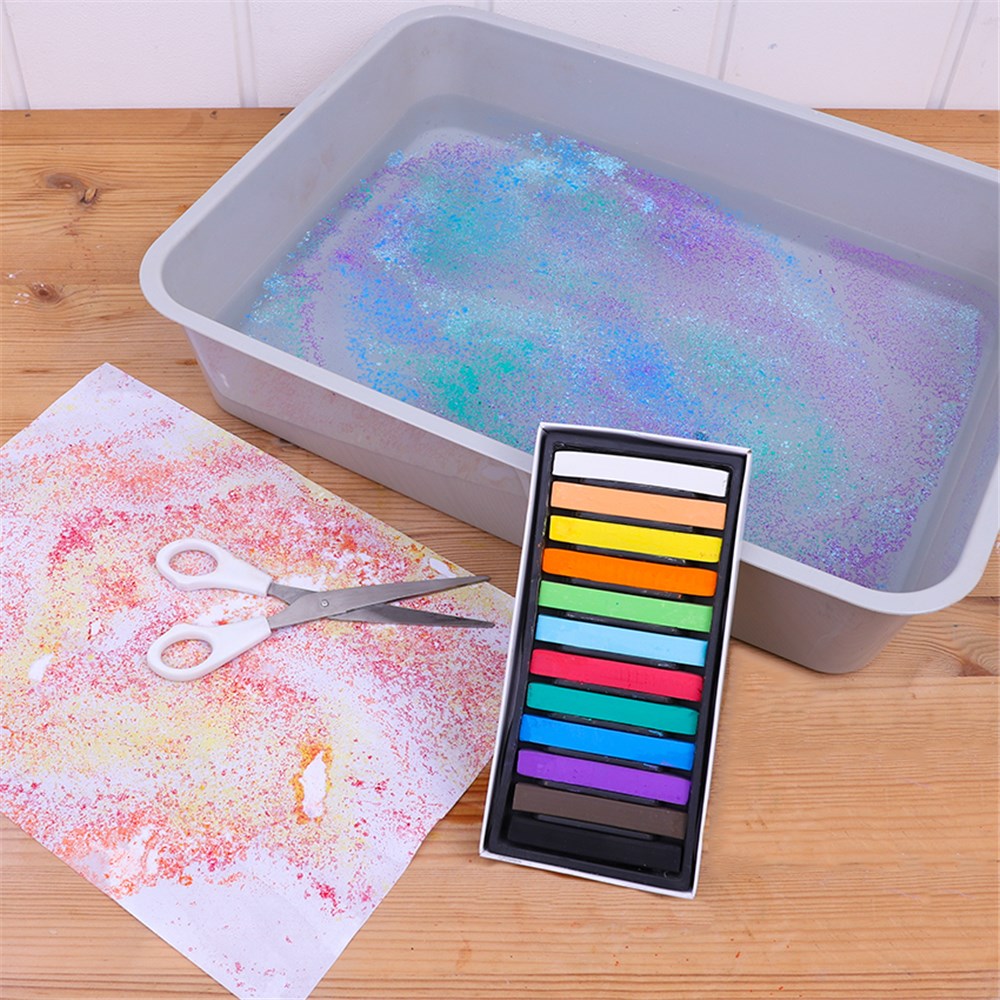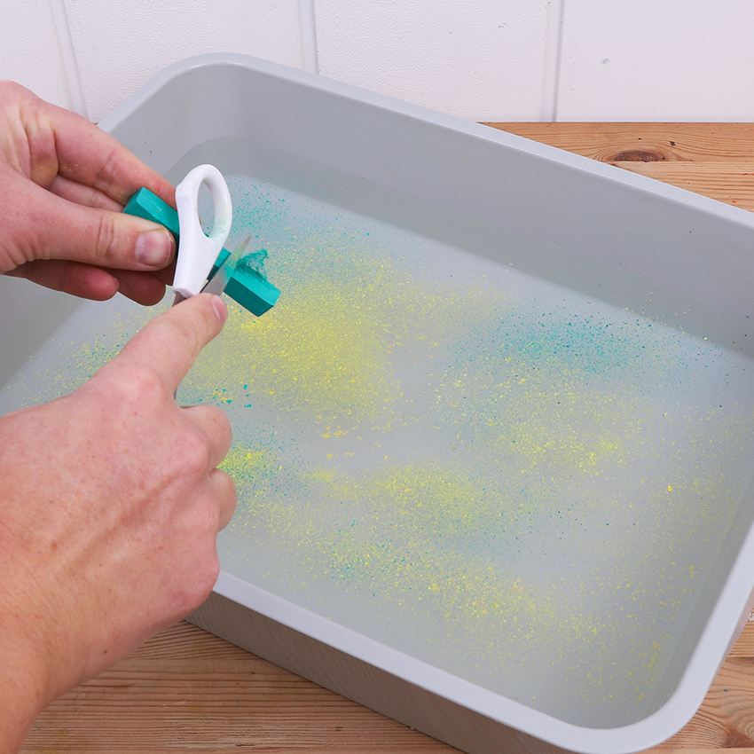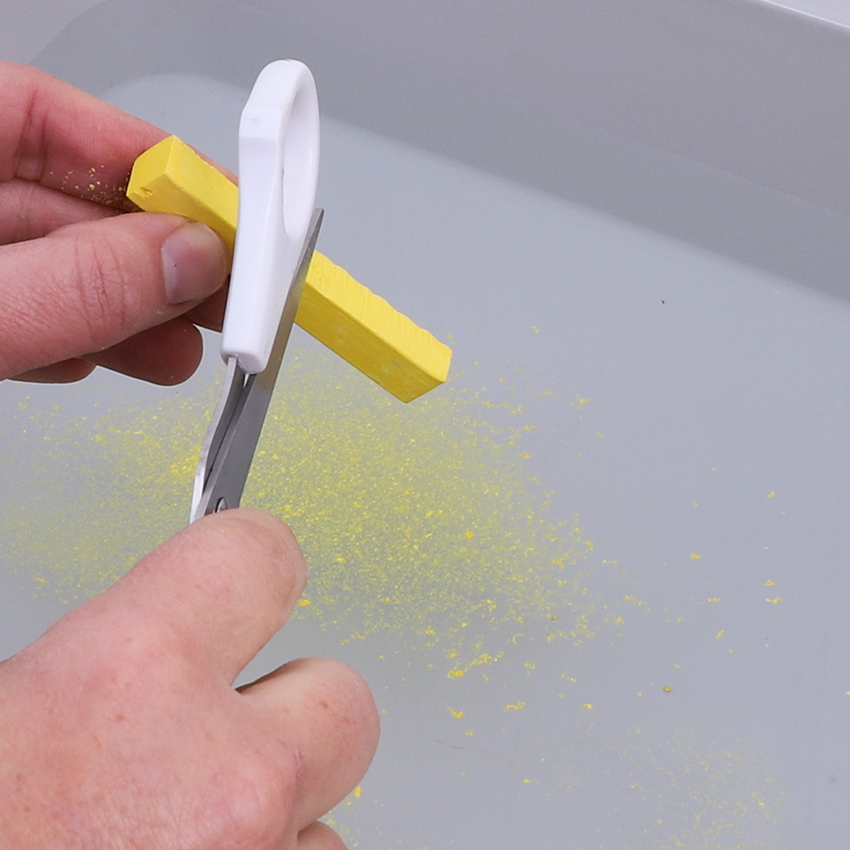 • Step 3Choose your first colour of soft pastel. Hold it at one end of the tray over the water. Open a pair of scissors and use one of the arm blades to run down the length of the pastel. Make sure you’re holding onto the pastel tightly and running the scissors down the flat edge away from your body. Be careful when using scissors in this way to ensure you do not hold onto the other arm blade. Adult supervision is recommended during this process. You will see the pigment from the pastel is being “shaved” off in small flecks and is landing and floating on the water below.