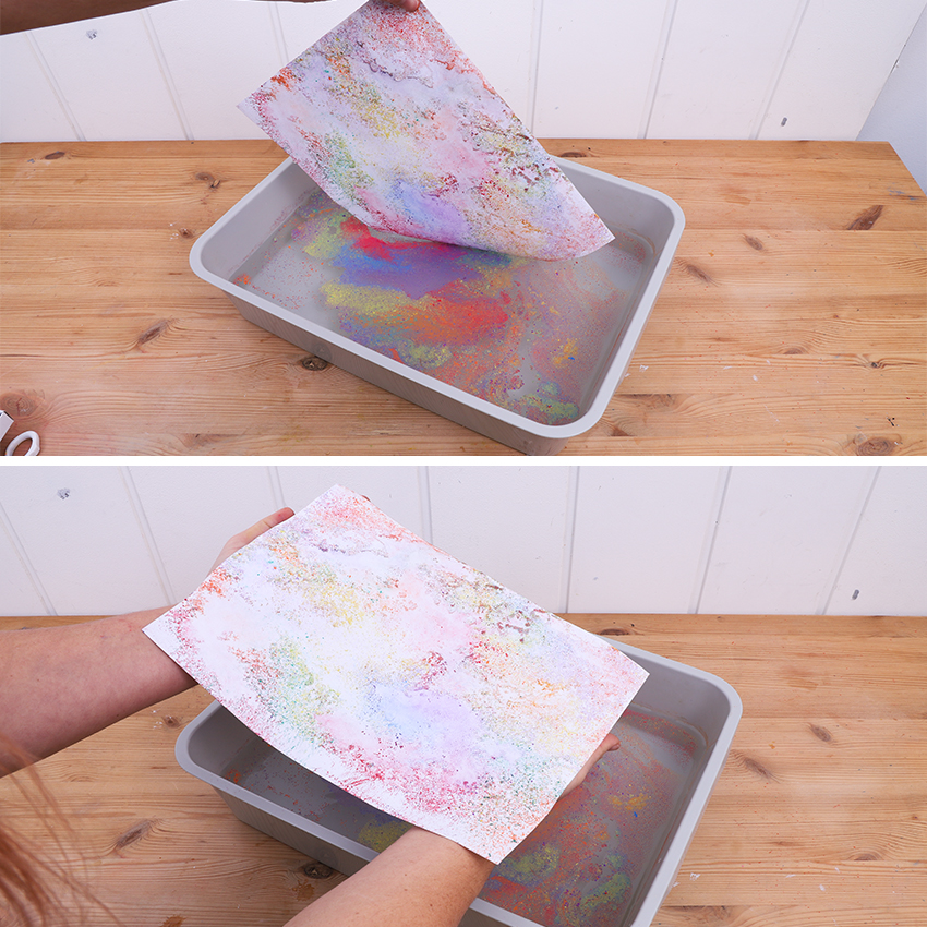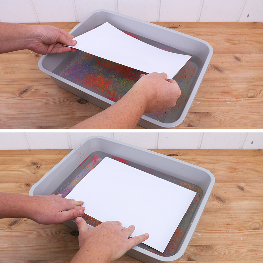 • Step 7Remove the paper from the water surface and allow to dry. If you have used a lot of pigment, there will likely be a lot left in the tray. Continue to use paper to pick the remaining pigment up off the water. Once all the pigment is gone, simply tip the water out, wipe clean and start again.