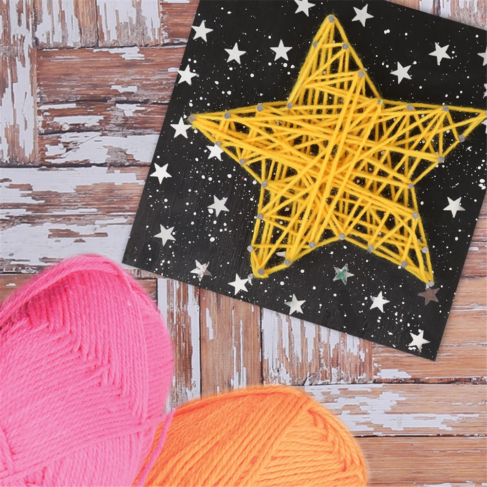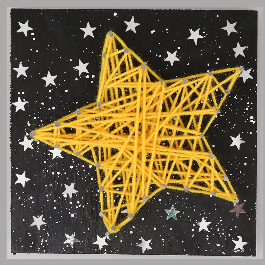 • Step 7Finish off your string art design by gluing glitter star sequins around the board and allowing to dry.