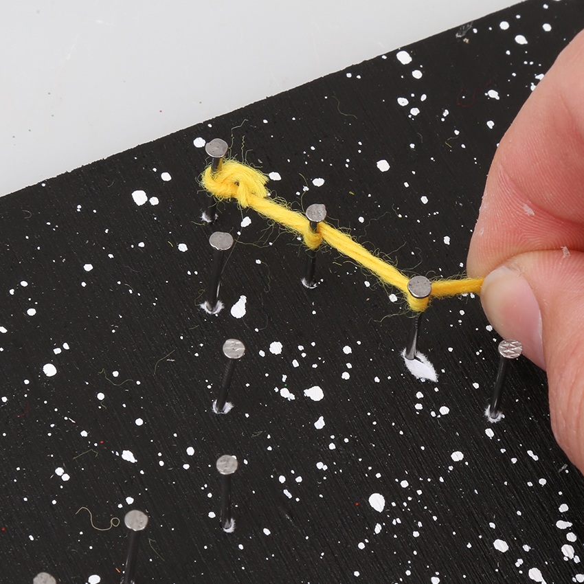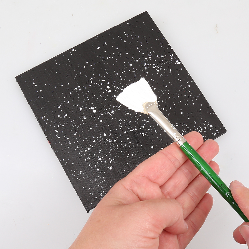 • Step 2Dip a fan brush into water and then load with white paint. Hold the brush flat over the string art board and tap on your hand to create paint spatters over the board. Continue tapping the brush until the board is covered so it looks like stars in a galaxy. Allow to dry.