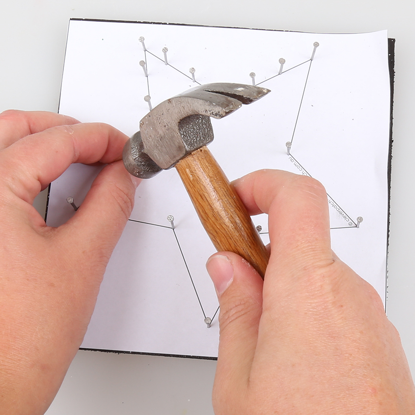 • Step 3Print and cut out the template you wish to use and place on top of the board. Adult supervision is recommended when using scissors. Once the template is in position, begin to hammer the nails into place around the outline of the shape, spacing the nails approximately 2cm apart. Adult supervision is recommended when using hammers and nails.