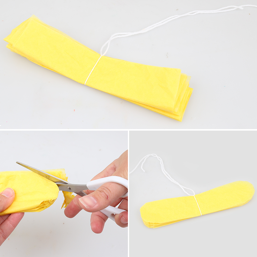 • Step 3Cut 1m of soft yarn wool and tie around the middle of the folded paper. Use scissors to round out both ends of the paper.