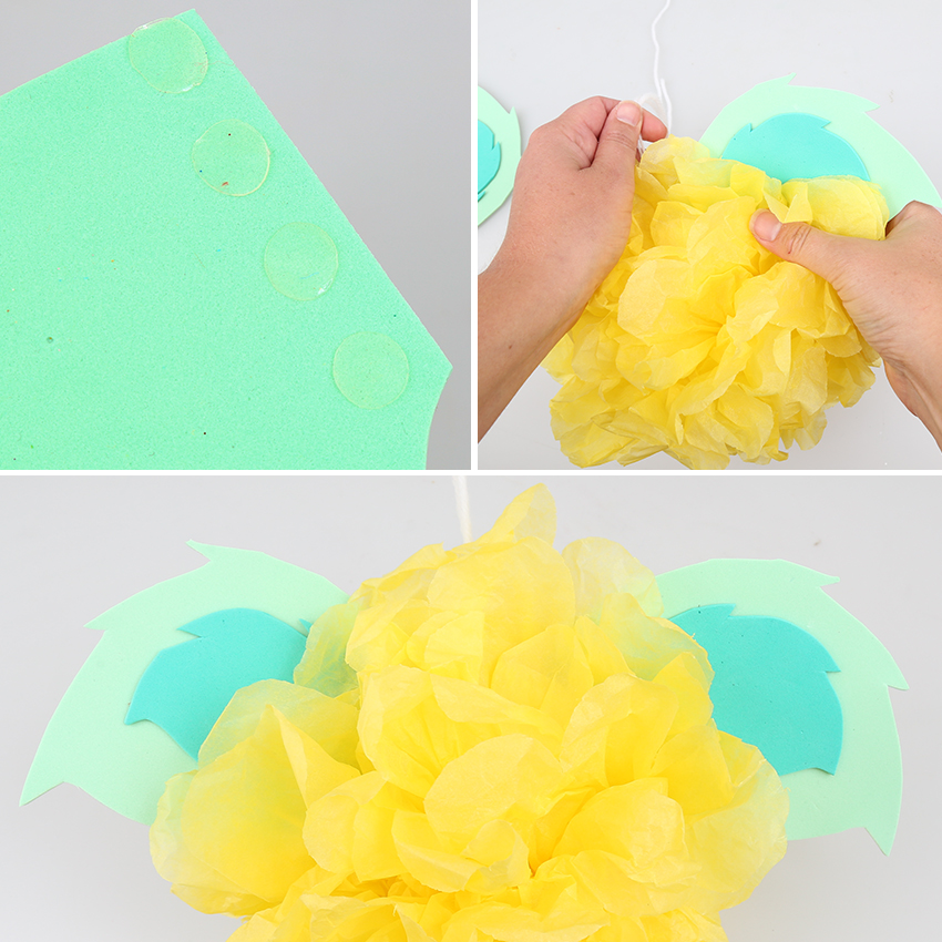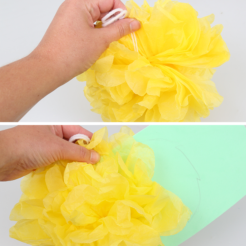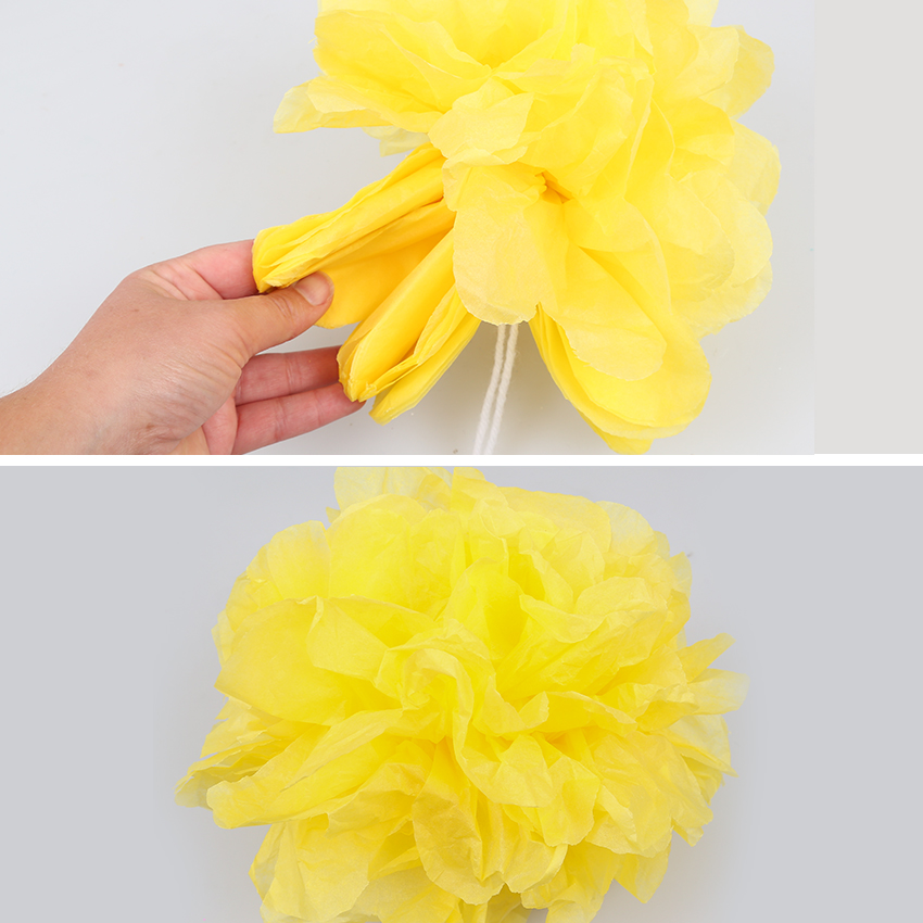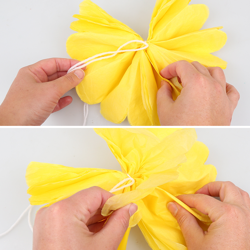 • Step 4Pull the edges of the tissue paper around to open up the folds, creating a flower like shape. Starting on one side, take the top layer of tissue and carefully bring it upwards, fluffing it up and pulling it gently towards the middle.