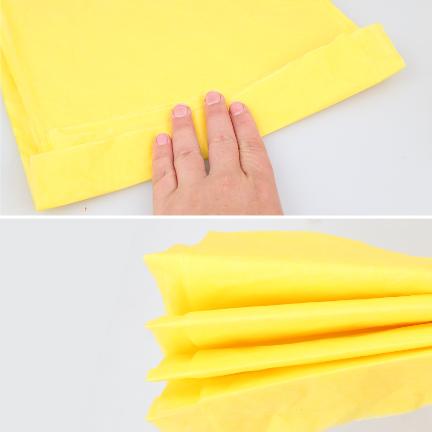 • Step 1Choose one colour of tissue paper and cut a large sheet in half then cut one of these halves in half again. Adult supervision is recommended when using scissors. Lay the sheets on top of one another in a pile.