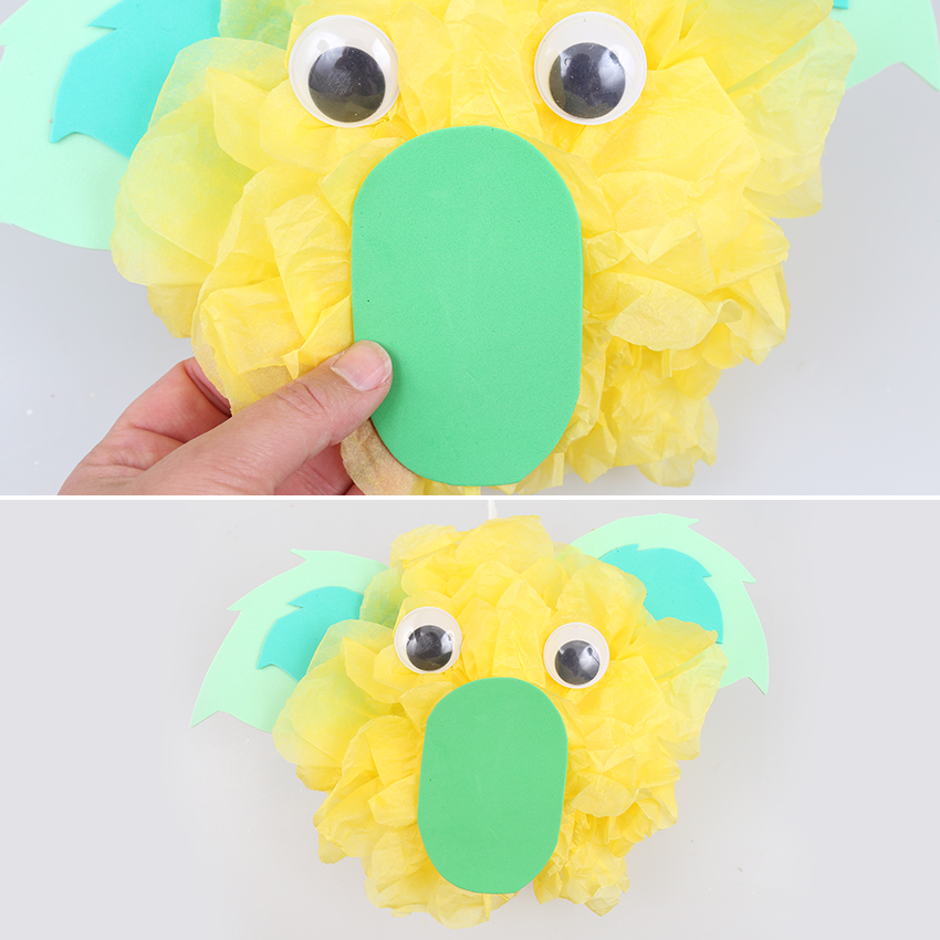 • Step 9Finish your koala by creating a face. Cut a nose shape from a foam sheet and attach to the front of the koala head using glue dots. Use glue dots to secure two wiggle eyes in place. Your koala is now ready to hang!