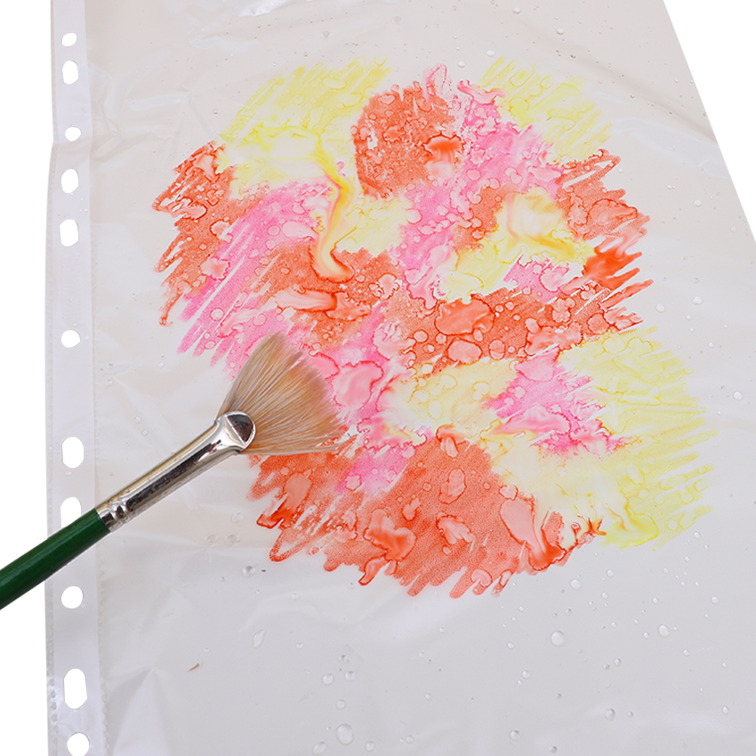 • Step 3Dip a fan brush into clean water and gently tap it on your hand above the coloured plastic sleeve to release water droplets onto the surface. You may already start to see the colours beginning to bleed and mix.