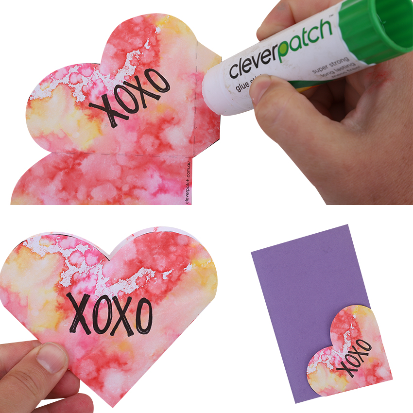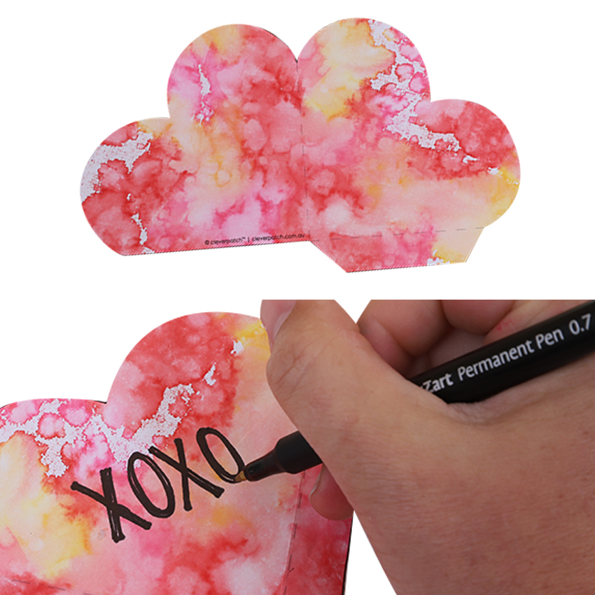 • Step 5Remove the plastic sleeve and allow the template to dry fully. Cut out the template piece along the solid black outline. Adult supervision is recommended when using scissors. Use a permanent pen to write your message onto one side of the hearts. Mountain fold along each grey dashed line on the template.