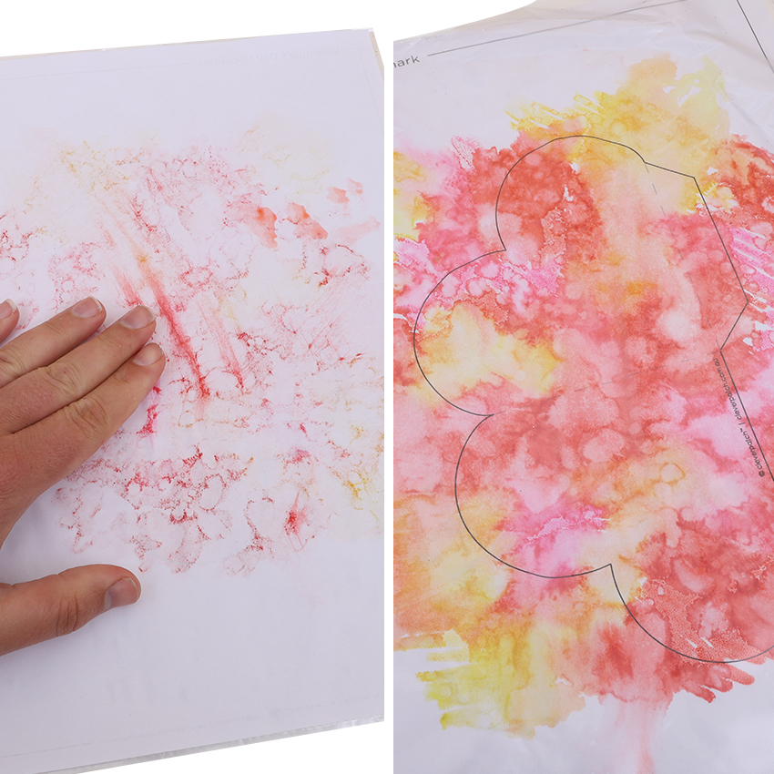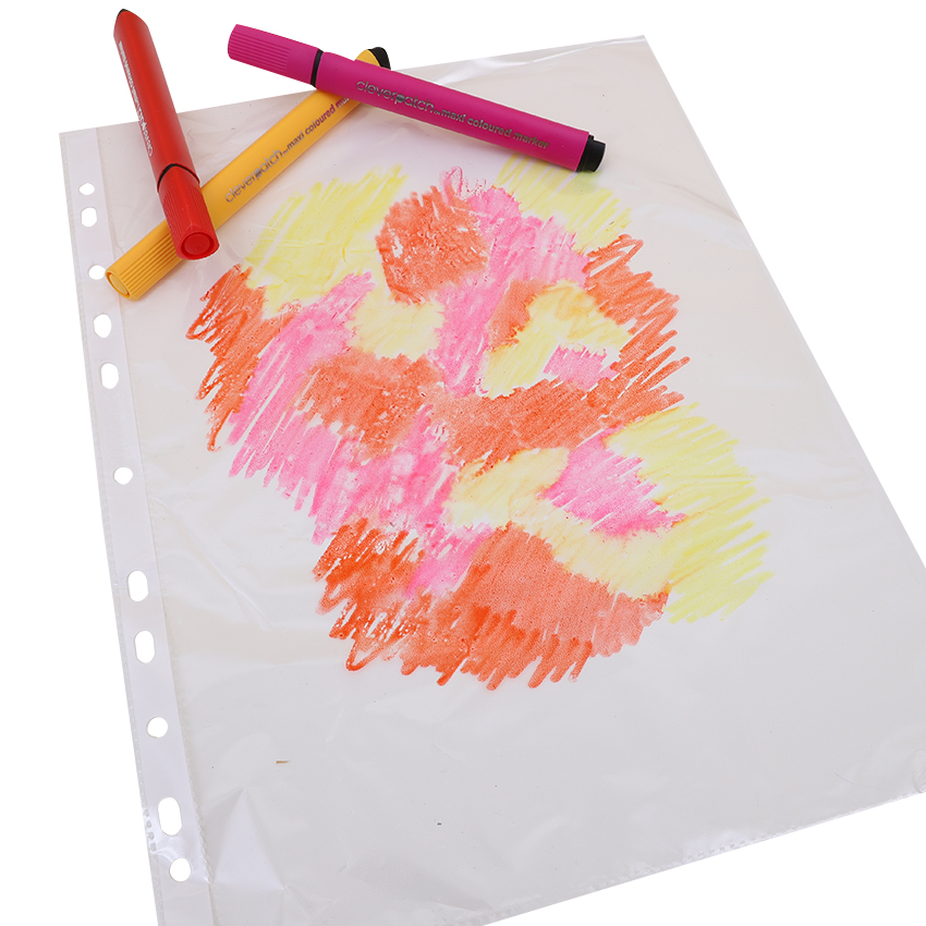 • Step 2Take a plastic sleeve and colour on top of it using markers. Think about which colours will go together well and what colours will be made if they bleed into one another. Be sure there is enough of the plastic sleeve coloured in to cover the template shape from step 1.