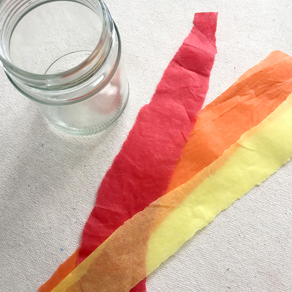 • Step 1 Tear a strip of each colour of your tissue paper making sure that it is long enough to wrap once around your jar.