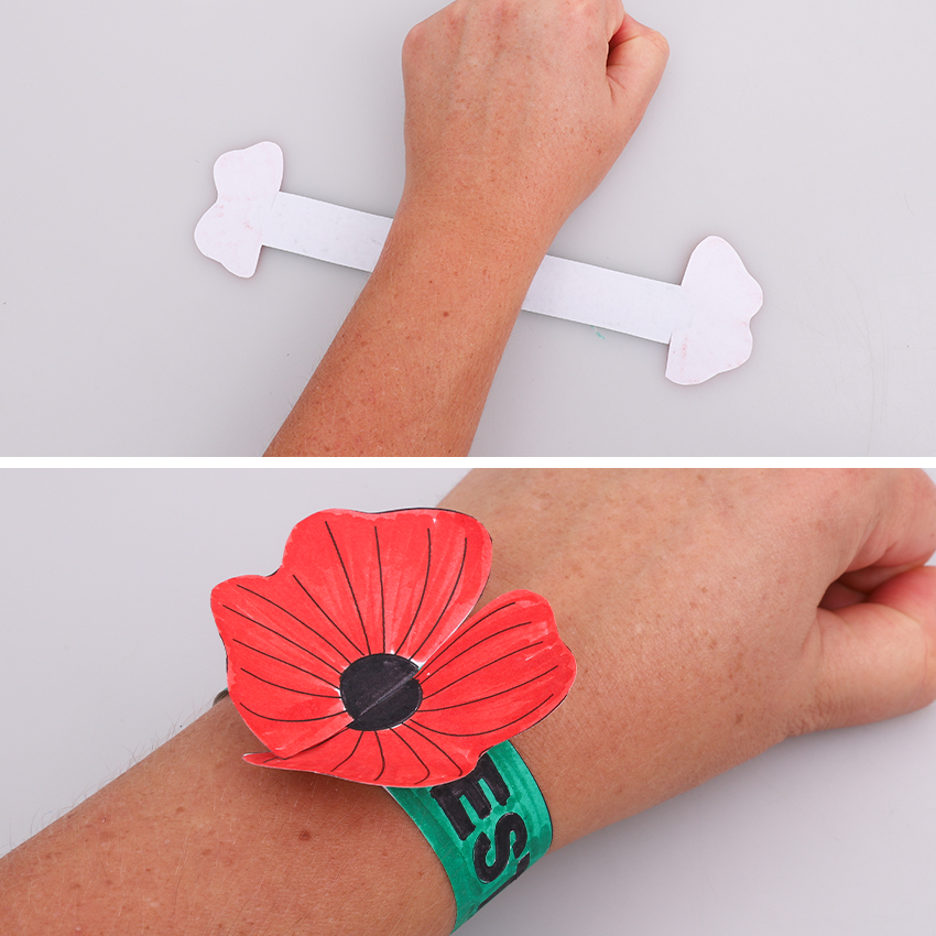 • Step 3Your Poppy Wristband is now ready to wear or gift! Choose a design and flip it over so the plain side is facing up. Place your wrist on top. Pull the end pieces up around your wrist and slot together using the slits you cut in Step 2. You might need to ask a friend or family member to help with this.