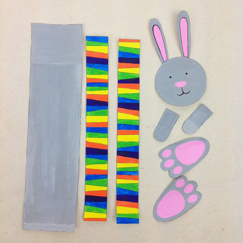 • Step 2Fold along the dotted lines on the long rectangular piece, then bend the longer side over in an arch like shape and use glue to secure the tab to the bottom (as shown in the image). This will be the bunny's body.