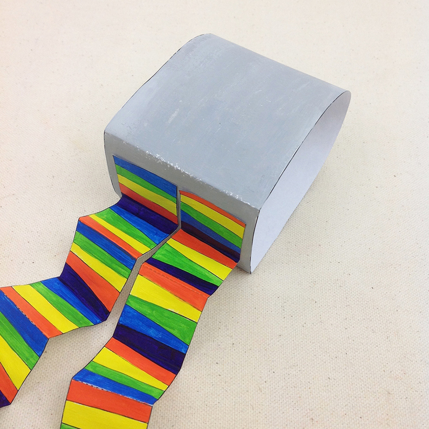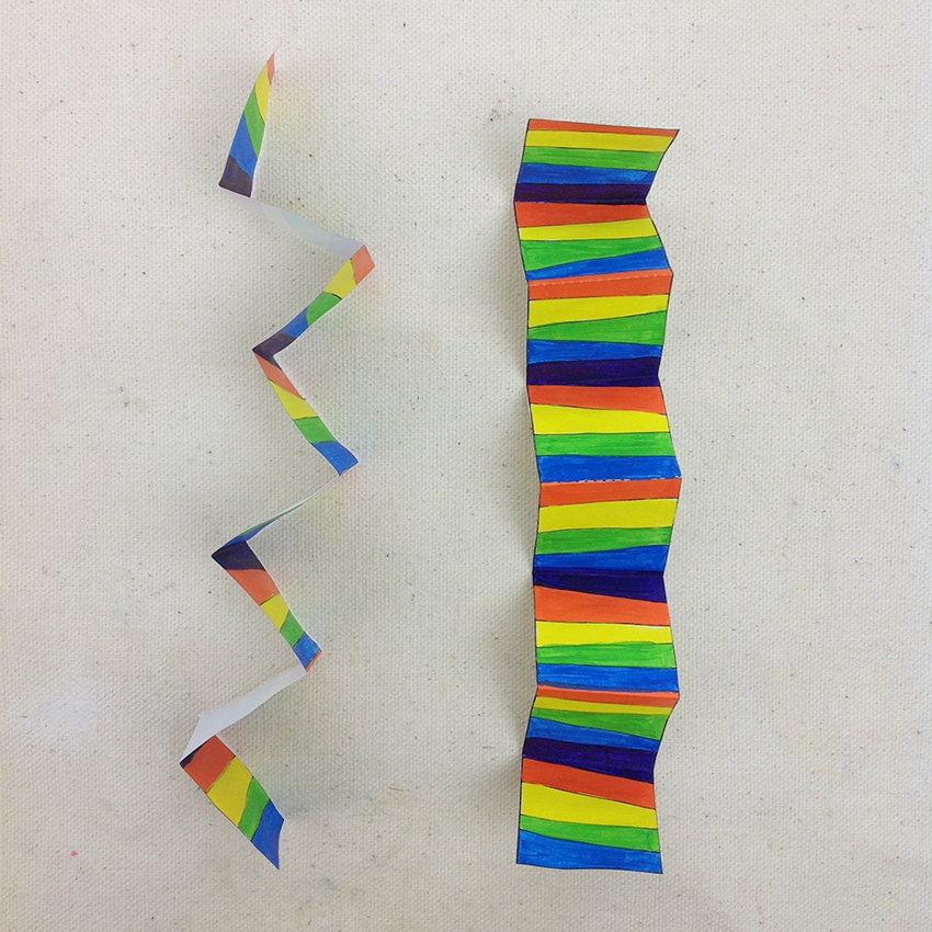 • Step 3Fold along the dotted lines on the two striped pieces. Once folded the pieces of paper should be in the shape of a zig zag.