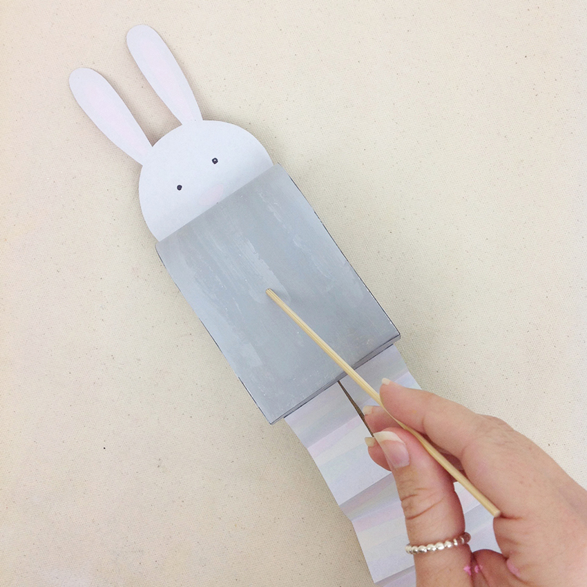 • Step 6Use a skewer and gently pierce it through the back of the bunny's body. This creates a handle for you to hold & bounce your bunny. Now your bunny is ready to bounce around and get excited for Easter!